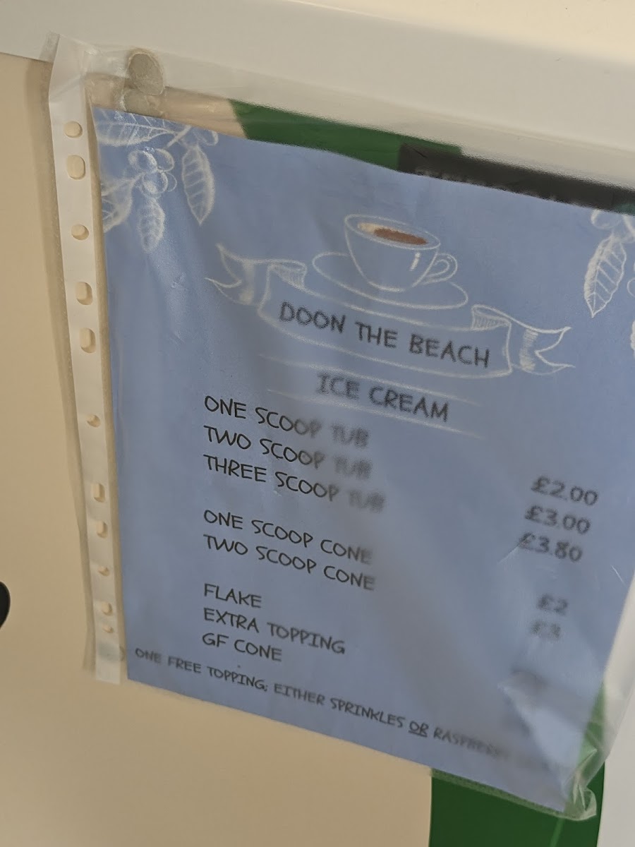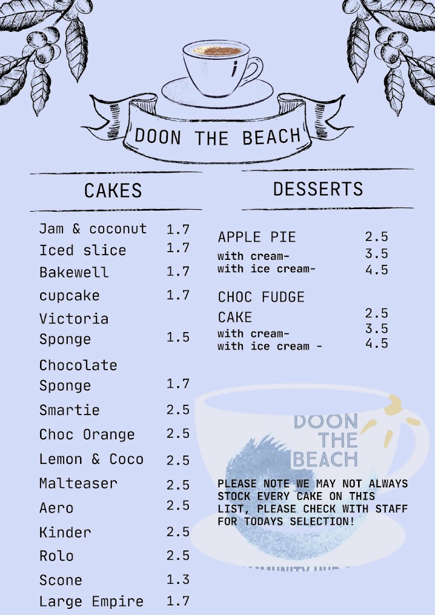 The menu at Doon The Beach Community Cafe offers a delightful range of options that cater to both savory and sweet cravings. For those with a sweet tooth, the cakes section features classics like Jam & Coconut and Iced Slice, with the Bakewell Cupcake and Smartie adding a fun twist. Dessert lovers can indulge in a comforting Apple Pie or a rich Choc Fudge Cake. If you're in the mood for a hot drink, the cafe offers favorites such as Latte, Flat White, and Americano, as well as a Mocha and Cappuccino for extra flavor. For a savory bite, the Hot Rolls are perfect, with choices like Roll & Bacon, Roll & Egg, and the hearty Breakfast Roll. There are also Cold Rolls such as Roll & Ham, Roll & Cheese/Vegan, and even a Roll & Quorn Ham/Chick for those seeking plant-based options. The cafe also serves simple but satisfying BLT and Ham sandwiches, as well as Quorn Ham/Chick Cheese for vegetarians. Toast is another comforting choice, available as Plain Toast, Toast & Beans, or Toast and Jam. Finally, for those wanting a sweet treat, the ice cream section offers the classic One Scoop Cone and Two Scoop Cone, with a Flake option to make it even more special. With affordable prices and a variety of choices, the cafe ensures there's something for everyone, making it a perfect stop for any time of day.
